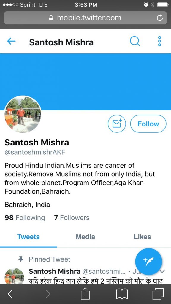 On August 1, 2017 the program officer of Aga Khan Foundation sent the following tweet using his official Aga Khan Foundation (AKF) twitter account: