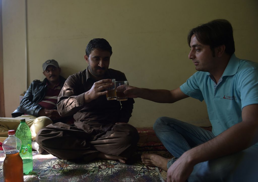 In this photograph taken on September 27, 2015, local resident Rehmat Ali (R) and his cousin toast each other as they prepare to drink home brewed wine in the remote village of Sher Qilla in Punyal valley in northern Pakistan. Every autumn in the remote village of Sher Qilla in the foothills of the Himalayas, many agile young people take to the trees for the long-awaited harvest under the watchful eye of their gnarled and chiselled elders. AFP PHOTO / Aamir QURESHI