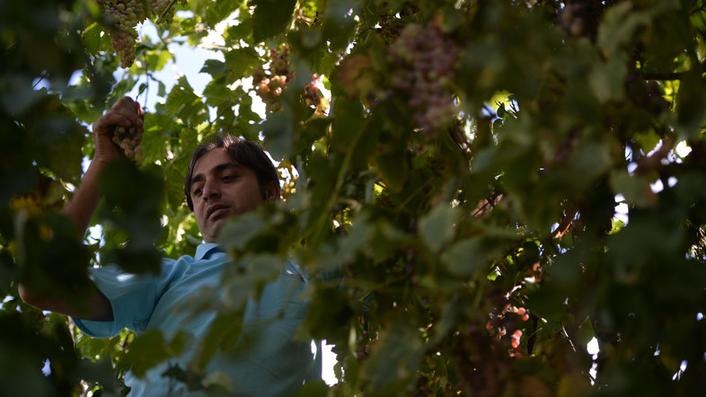 Rehmat, slim, and with an aquiline nose, begins to pick the forbidden fruit. Working with his bare hands, he places the green and crimson grapes in a wicker basket that is lowered to the ground along a rope.”