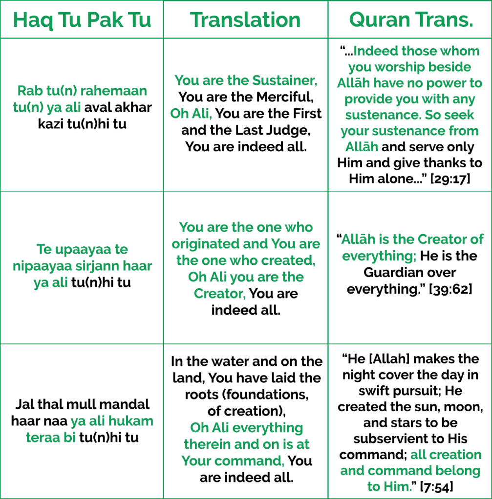 | Venatee Karu(n) Chhu(n) Saaheb Moraa | The ever-living Lord and Master has his seat in Kahak, manifest in the form of ʿAlī. He is the seventy-seventh vessel and fortieth Imaam, made manifest as Shah Nizar. |