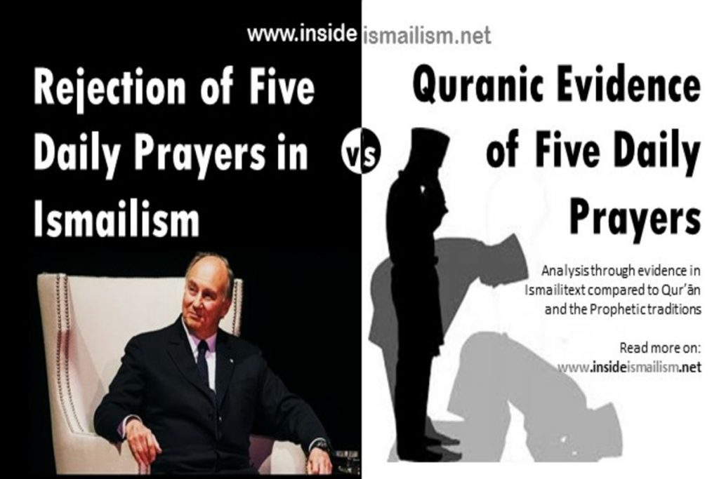 Ismāʿīlīs openly reject the five daily prayers which are observed by Muslims. Not only do the Ismāʿīlīs reject the number of prayers, but they also reject the method of the prayer and performance of ablution (wuḍūʼ) before the five daily prayers as prescribed by the Qur’ān. In this paper we analyze basis on which the commandment of Allāh is rejected by the Ismāʿīlīs, the counter reasoning by Muslim scholars of the entire Muslim world and then three shocking revelations: one from early Ismāʿīlī text which actually commanded the five daily prayers, the other claim by Karim Aga Khan that he actually observes five daily prayers and then the fact that Ismāʿīlīs even reject the regular sunrise and sunset prayers even though publicly they align themselves with the Shīʿah interpretation of three prayers instead of five.