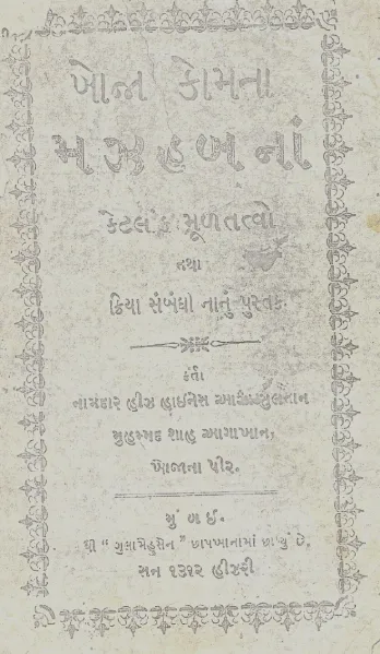 Scan from the book “Khoja Komna Ketlak Mool Tattwo Tatha Kriya Sambath Nanu Pustak” authored by Aga Khan III himself.