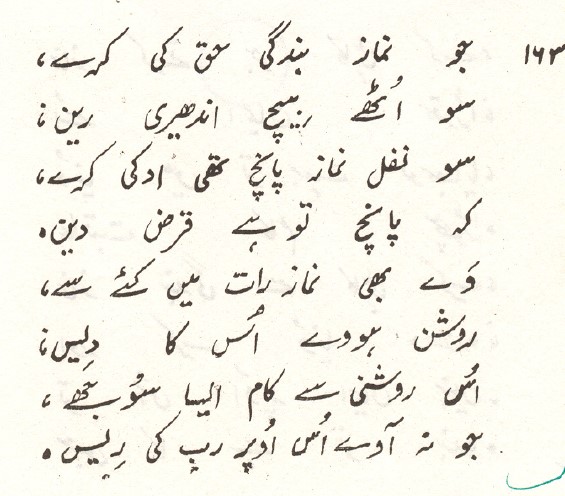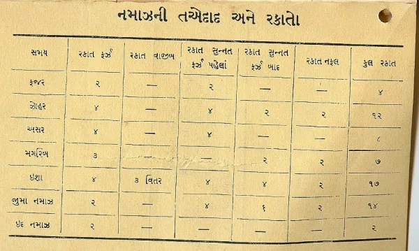 Herein the author in his book claims that there is no mention of the five times prayer in the Qurʾān. He claims that these prayers are three only viz. in Islamic terms fajr, maġrib and ʿišāʾ, though Ismāʿīlīs do not call them by the names of ṣalāt al-faǧr, ṣalāt al-maġrib and ṣalāt al-ʿišāʾ and instead name them as subuh ji duʿāʾ, sanji ji duʿāʾ, and somni ji duʿāʾ.