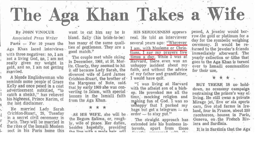 Scan of the page from Sunday Times titled “Aga Khan Takes a Wife” in which Aga Khan publicly claims offering 5 times prayers. [High Resolution]
