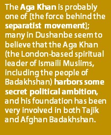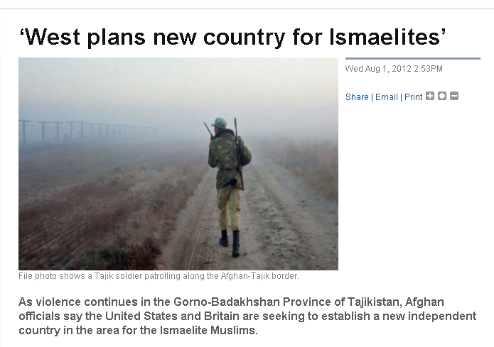 Sayfullo Safarov, the deputy director of the Center for Strategic Studies also pointed out his observations and added to the evident motives of the separatists movements like the Ismaili Pamiris in Tajikistan and the Ismailis in parts of Afghanistan and Pakistan, that forces supported by some countries aim to combine Pakistan’s Gilgit and Chitral regions, parts of the historical Badakhshan region in Afghanistan and Tajikistan, and a section of China’s territory to form a new country of “The Greater Badakhshan”. One wonders what “forces” and “countries” Safarov is implying are behind this separatist movement. The Aga Khan is probably one of them; many in Dushanbe seem to believe that the Aga Khan (the London-based spiritual leader of Ismaili Muslims, including the people of Badakhshan) harbors some secret political ambition, and his foundation has been very involved in both Tajik and Afghan Badakhshan. (Source: Are Outside Forces Conspiring To Create “Great Badakhshan”? | Eurasia http://www.eurasianet.org/node/67342)