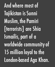 Gorno Badakhshan – the region of which Khorog is the capital – is the most mountainous, remote part of an already very mountainous and remote country. Its geography is dominated by the Pamir (from Persian meaning “the roof of the world”) Mountains, part of the same mountain system that includes the Himalayas and Hindu Kush. It is sparsely populated: Badakhshan’s roughly 250,000 people represent 3 percent of Tajikistan’s total population, but the territory occupies almost half of the entire country. The people, known as Pamiris, speak various Iranian languages that are related to, but not mutually comprehensible with, the Tajik spoken in the rest of Tajikistan. And where most of Tajikistan is Sunni Muslim, the Pamiri [terrorists] are Shia Ismailis, part of a worldwide community of 15 million loyal to the London-based Aga Khan. (Source: The Atlantic, http://www.theatlantic.com/international/archive/2013/06/the-tajiks-who-fight-their-own-government/277336/)