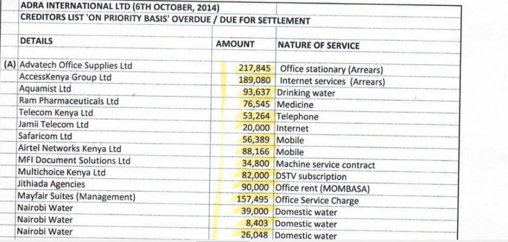 Abdulmalek, ever the diligent banker, kept meticulous records of his disbursements to his friends, although not the reasons for making them. The accounts with Pankaj and Raj show some interesting transactions. They made the Imperial Bank MD pay for their upkeep with supermarket shopping, their staff payrolls and even their DSTV bills. An email received by the bank in October 2014 had a list of creditors that Adra wanted Imperial Bank to pay. The list had all the costs of its Nairobi and Mombasa offices including rent, water, stationery, alarm services, internet, air conditioning, fuel, garage, a bank loan, and credit cards.