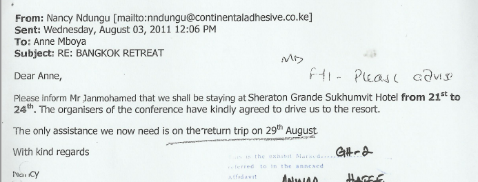 For the five days between August 24th and August 29th 2011, this luxury spa hosted three Kenyan guests. Only one name was recorded, Mrs. Ndungu. Her company was only recorded next to her name as 2 Pax. 21 days before this, a lady called Nancy Ndungu had sent an email from her official company mail to Anne Mboya, Abdulmalek’s trusted personal assistant of 19 years. Anne printed the email, hand wrote on a space on the right MD: FYI-Please advice.