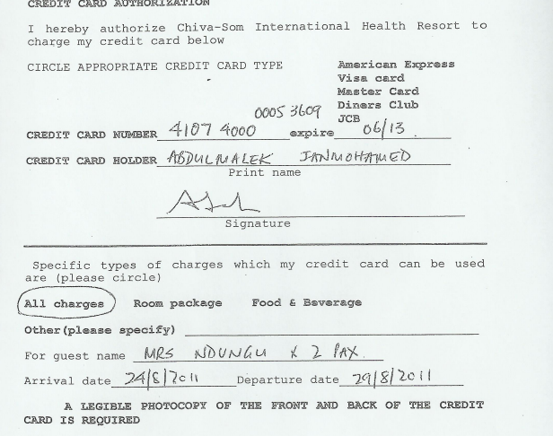 But Abdulmalek was not just giving directions to his friends. He also sent a credit card authorization, complete with scanned copies of his personal credit card, to the health resort. He filled and signed the authorization, and circled the part that allowed All Charges to be charged to the credit card. The guests would be Mrs. Ndung’u and her company of two.