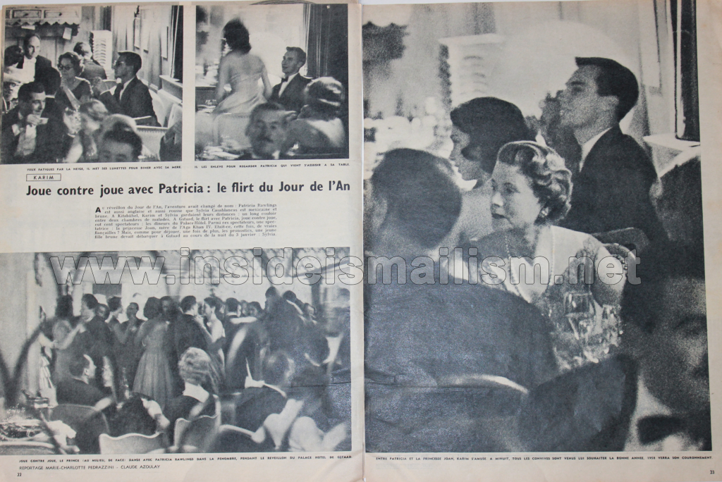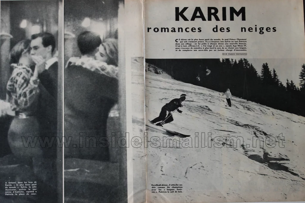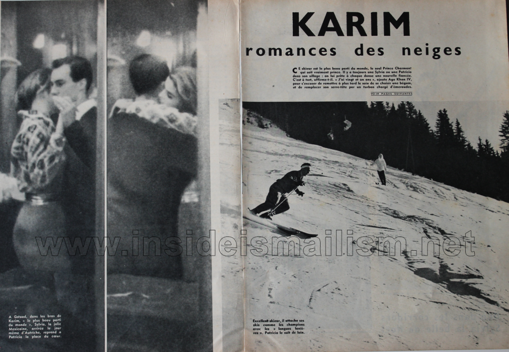 The story scanned and uploaded here on the Inside Ismailism blog appeared in a French-language magazine and named only a few of Karim Aga Khan’s women. He is pictured here with the almost-begum Sylvia Casablanca and another almost-begum Patricia Deblave — both of who her never married, but “dated” on consecutive nights.