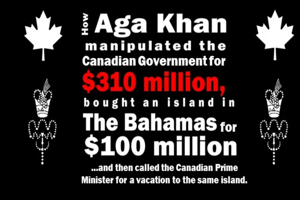 How the Aga Khan manipulated the Canadian government for obtaining $310 million in grants from taxpayers’ money from 2004-2016, bought the most expensive island in The Bahamas for $100 million while himself ‘donating’ $1 million to the Bahamas National Trust, and called the Canadian PM and the Liberal Party leaders for a vacation to the same island.