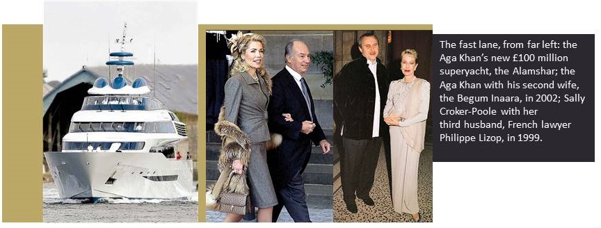 In 1994 came the inevitable divorce. Sally emerged with £20 million and auctioned off her jewelry for £17.5 million through Christie’s. Now 67, she now spends her time between her £25 million mansion overlooking Lake Geneva and her 10,700sq ft. £15 million London apartment at Hyde Park Gardens, known as the ‘Palazzo Apartment’. She has since remarried. Her husband, French lawyer Philippe Lizop, is deputy chairman of David Linley and Co. Her eldest son Rahim was educated at the £45,000-a-year Institut Le Rosey, the boarding school for the European elite and royal families, based in the Swiss village of Rolle. The pupils are heirs to the world’s great private fortunes and royal titles: the Shah of IranKing Albert II of Belgium and Prince Rainier III of Monaco all attended.