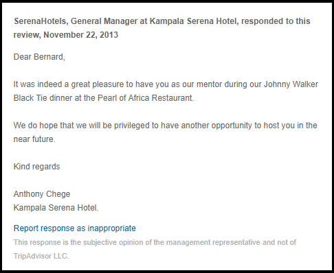 An acknowledgement by General Manager of Serena Hotels, of the review posted on TripAdvisor for the Johnny Walker Black Tie Dinner. Courtesy of TripAdvisor.