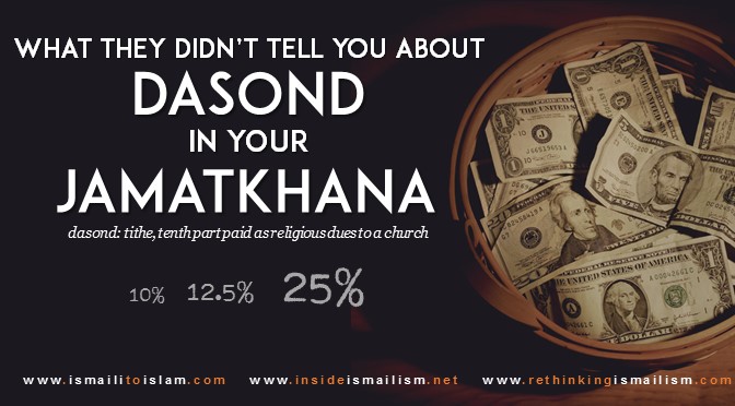 Christians pay ten percent (or ‘tithe’) to the church every time they visit. This is exactly where the name ‘dasond’ comes from. By definition, dasond means ‘tenth’. Ismāʿīlīs pay anything but 10% on their savings. They actually pay at least 12.5% on their income, not knowing what the background of this payment towards their Imām is.